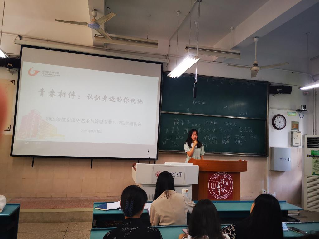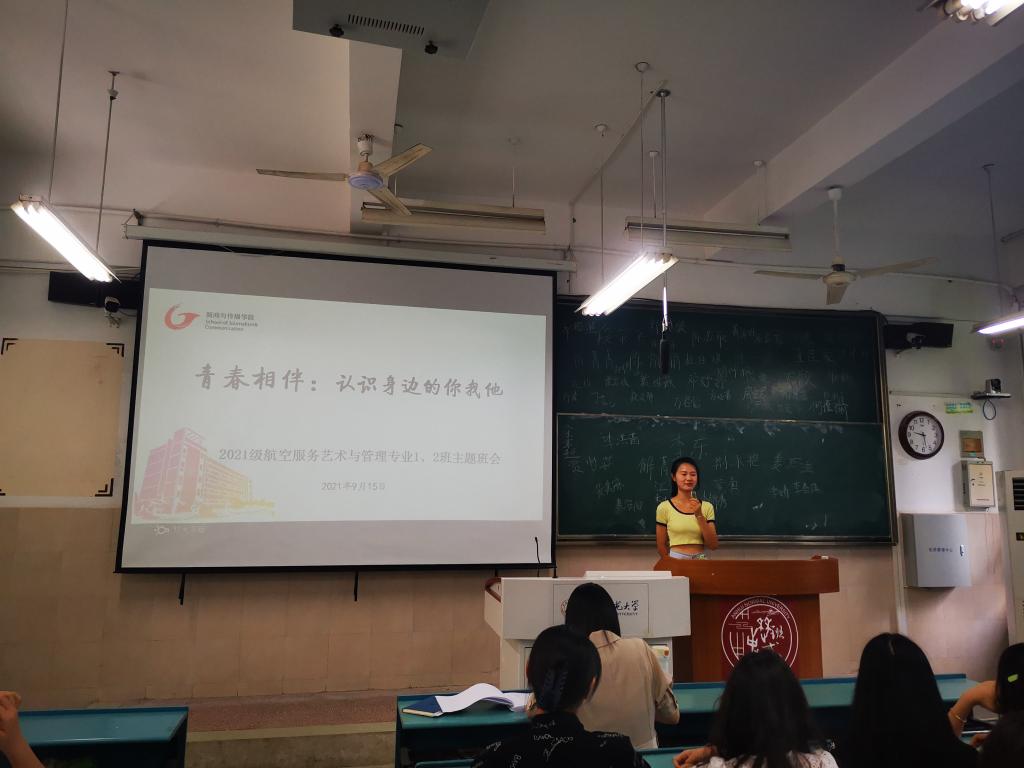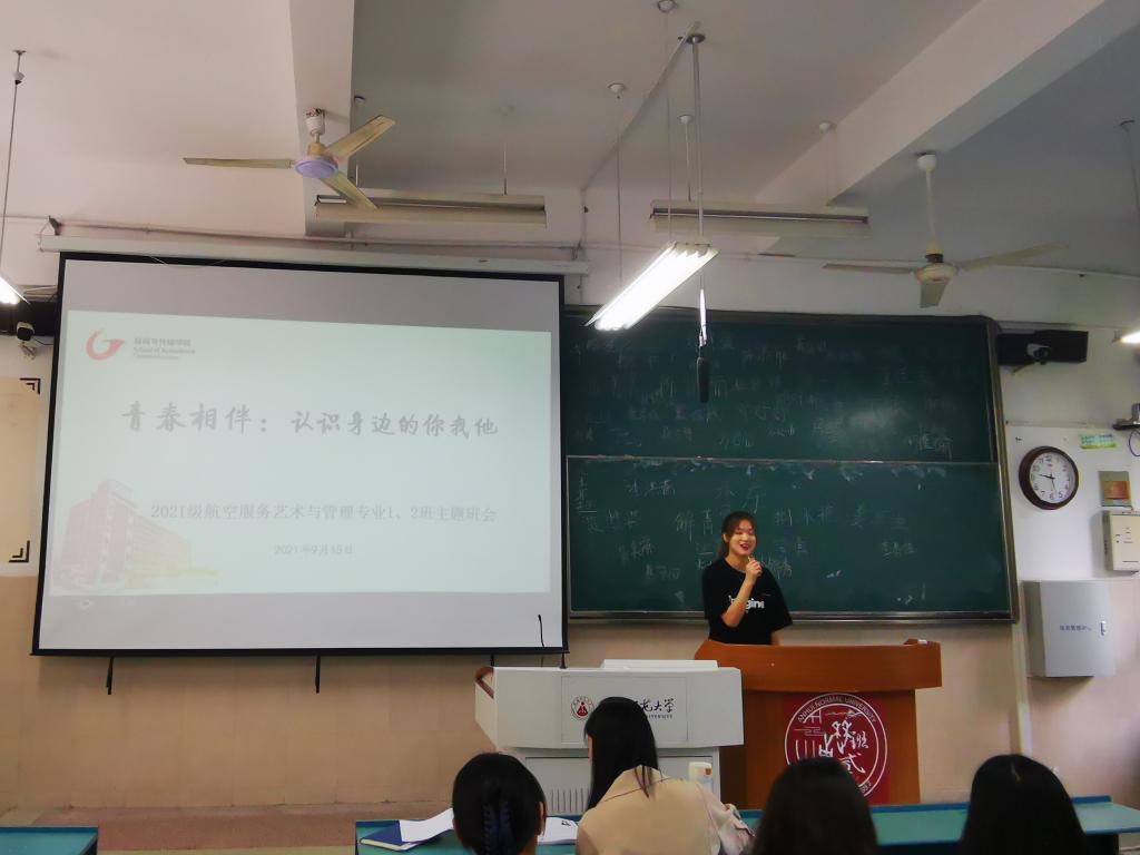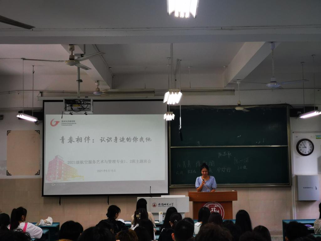 9月15日上午,2021级航空服务艺术与管理1、2班在教学楼2050102教室召开破冰班会,会议由辅导员张雁主持,生活辅导员俞应芬出席,全体同学到场。