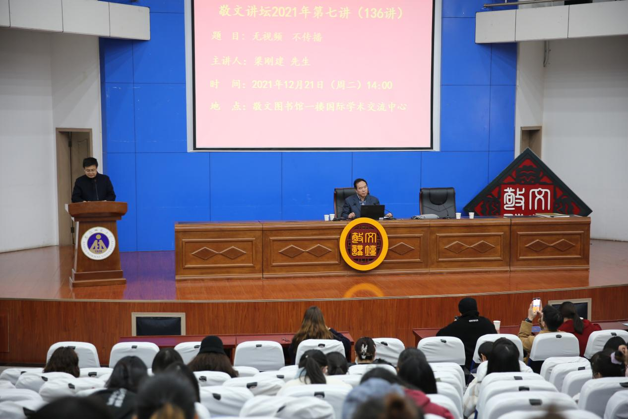 12月21日下午,中国广播电影电视报刊协会会长、《广电时评》总编辑梁刚建应邀为我院师生做了主题为“无视频,不传播”的讲座,讲座在敬文图书馆一楼国际学生交流中心举行,图书馆副馆长刘和文主持讲座,学院副院长马梅、部分教师代表以及本科生、研究生代表参加了此次讲座。