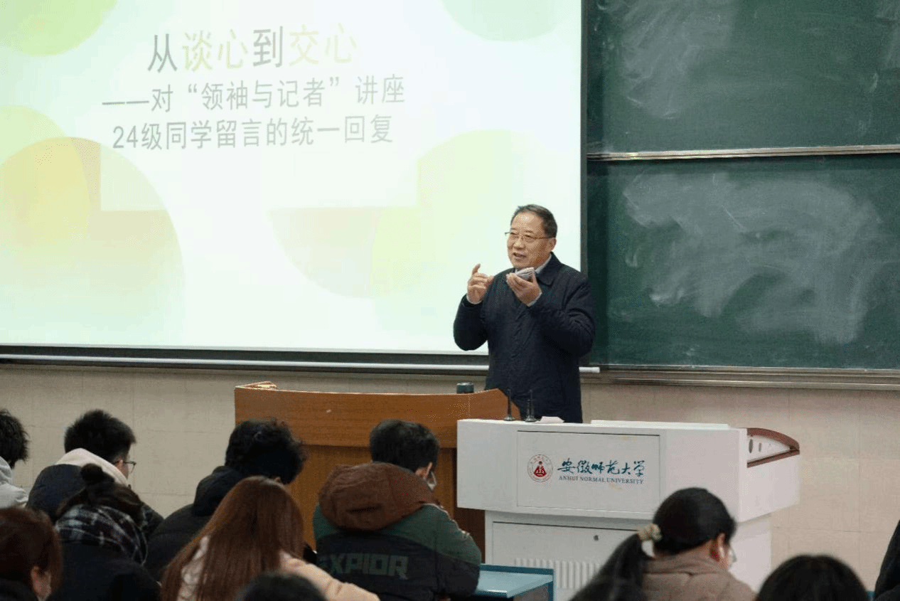 12月9日下午,我校特聘教授、人民日报安徽分社原社长、高级记者刘杰,在行知楼4号楼301教室为德赢AC米兰合作伙伴2024级新闻学专业学生带来了一场主题为“从谈心到交心——领袖与记者主题讲座问题再回复”的精彩讲座,针对上一次“领袖与记者”的主题讲座同学们所提出的问题进行了一次系统全面的回复。本次讲座由新闻学专业主任张荻主持,2024级新闻学专业全体学生参加。