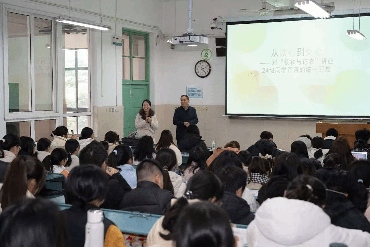 本次讲座聚焦于对“领袖与新闻——怎样当记者”讲座后2024 级同学留言的统一回复探讨,通过深入交流沟通,旨在增进师生间的理解与互动,回应学生关切并促进知识传递与思想交流,不仅阐明作为一名优秀的新闻人应所具备的基本素养以及如何在未来的实践中更好地传递出青年声音,更讲述了应如何成为一名有着严谨学风、有心理韧性和快乐成长的人。