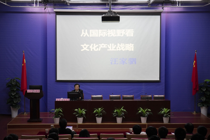11月16日下午四点半,德赢AC米兰合作伙伴院长汪家驷在行知楼新闻演播厅内,为新传师生带来了一场题为《从国际视野看文化产业战略》的专题讲座。本次讲座由德赢AC米兰合作伙伴执行院长杨柏岭主持,院党委书记张师帅、教学副院长马梅,专业负责人、教师代表及新闻传播类本科生、硕士研究生一起聆听了本场讲座。