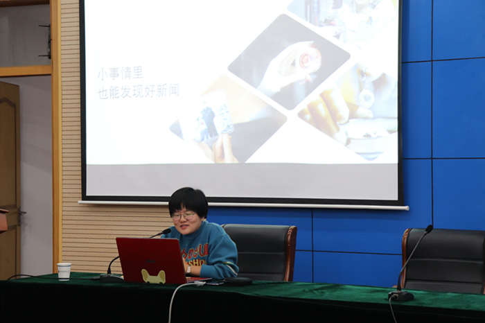讲座正式开始,温沁由《传递光明》《住院医师的48小时》和《长大后我就成了你》等具体的新闻作品引入,点出“小事情里也能发现好新闻”,并给现场同学们分享了这些优秀的文图报道、视频作品,获得了阵阵掌声。