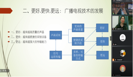 周勇院长首先以马克思、恩格斯的名言进行引入讲座,详细讲解了从照相术到如今的5G传输技术的百年视听技术的发展史。“全部视听传播技术的发展史,就是视听信息生产质量和传输能力不断提升的历史”。讲座内容的大框架为:一、视听传播时代的到来:广播电视的诞生;二、更好.更快.更远:广播电视的发展;三、视听新技术与多元视听传播格局。周勇院长语言逻辑清晰,PPT图文并茂,生动的向同学们讲解视听传播技术的演进与发展。此外,周勇院长还向同学们建议,希望新闻专业的学生能够成为“一专多能”的人,既要有全媒体能力,也要守住自身的独特性。