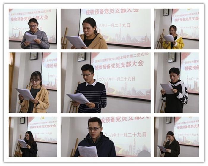 余梦雅首先向大会报告人员到会情况。随后,周普、丁平、乔羽等9名发展对象逐个向大会宣读入党志愿书,以及汇报需要向党组织说明的问题。汇报结束后,入党介绍人余梦雅、朱小冉结合群众座谈会记录分别介绍了发展对象的培养过程和审查情况等详细情况,并对其入党表明了自己的意见。