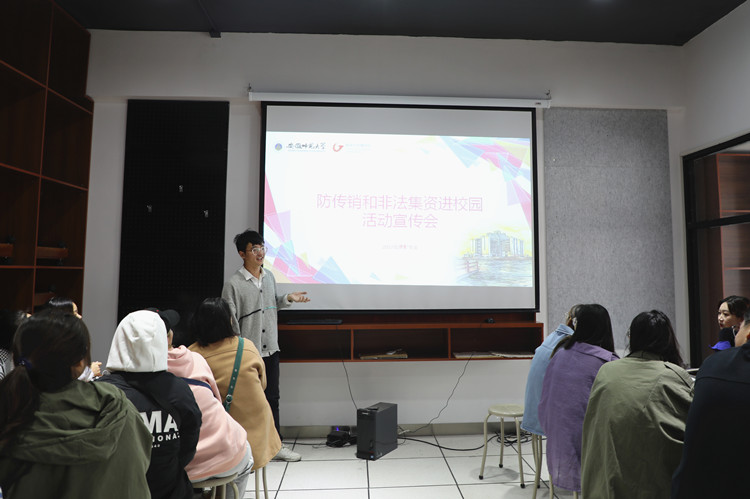 推优会后,左戈主持开展了“防传销防非法集资进校园”主题会议。他先以“非法集资”为例,向同学们简单地介绍了“经济犯罪”的概念,进而引出关注度日益上升的“传销”问题。左戈结合国家出台的相关法律规定,细致详尽地向大家说明了传销和非法集资的危害性,引导学生树立正确消费观念。