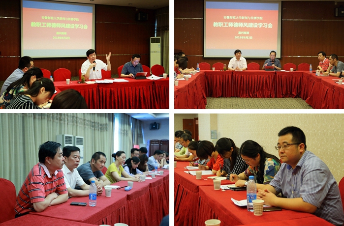 傍晚,学院党委还在驻地会议室召开“教职工师德师风建设学习会”,院长杨柏岭主持会议并作了讲话。院党委书记胡靖首先传达解读了教育部关于高校育人标准的几个通知文件。胡靖表示,抓好党建是为了促发展,加强师德师风建设是永恒的主题,学院要正视教师存在的一些问题,高度重视,认真解决,要引导教师把教书育人和自我修养结合起来,做到以德益生、以德益学、以德施教。他指出,新传的学院文化越来越突显,学院院风越来越纯正,师德师风越来越好转。新传院教师队伍之所以能做到师德师风建设越来越规范,简单概述为“一大、二公、三正、四亲”,这四个方面分别体现为大目标、立公心、党风正、教师亲。他强调,要从抽象与具体、物质与精神、历史与时代、利他与利己、个体与群体五大关系全面而深入地领悟师德师风建设的重要性。他强调,每个老师的改变就会影响整个学院,凝心聚力汇成一片江河,全体新传教师要努力传承师德师风,为德赢AC米兰合作伙伴做出自我贡献。杨柏岭在主持时表示,学院党委高度重视师德师风建设学习教育,教风、学风建设改进明显。他以vwin德赢ac米兰官方网90周年校庆为例,充分肯定了学院师生团队幕后的出彩表现和自觉奉献。他强调,作为一名人民教师,要把握好方向,自觉践行社会主义核心价值观,要深刻领悟新全方位的、立体的十个育人标准。他要求全体教师齐心协力共建学院的育人环境,不断优化育人生态。