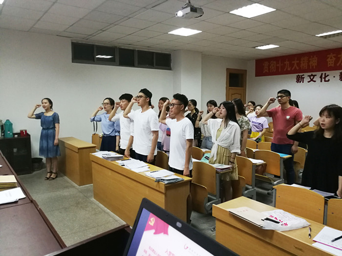 最后,大会还组织全体党员重温入党誓词,教育引导支部全体毕业生党员铭记党员身份,增强党性修养。全体起立,手心握拳,再一次面对党旗口中掷地有声的80个字,党员同志们不仅牢记于心,更是在毕业期间身体力行,坚守党员职责。孙月婷叮嘱毕业生党员们在离校之际,守住最后一班岗,在文明离校过程中发挥党员的先锋模范作用;帮助同学们文明、有序、和谐离校,严格遵守学校的规章制度,不打架,不酗酒滋事,不乱扔垃圾,不乱贴乱画,爱护学校公共财物设施,并用自己的行动影响他人,离校前为学弟学妹们留一间整洁的宿舍,也为自己的大学生活画上了一个圆满的句号,为母校留下属于2014级的美好记忆。(文/图 何修豪 刘静雯)