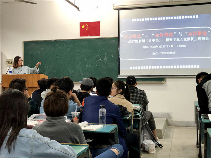 为进一步做好共青团推优工作,3月26日晚七点,2017级新闻班(含中英)、播音专业入党推优主题班会于2070205教室举行。会议由辅导员老师张虹主持,新闻班(含中英)、播音班全体同学共同参加。