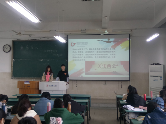 2018年3月14日上午,2016级新闻学专业在2010501举行了学习两会精神主题班会,会议由班级心理健康委员徐嘉明和郭倩主持,16新闻全体成员参加此次班会。