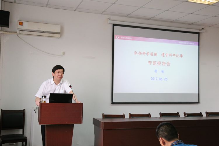 6月27日下午,学院在院四楼会议室召开了“弘扬科学道德、遵守科研纪律”专题报告会。报告会由党委书记胡靖主讲,全体教职工参加了会议。胡靖指出,教师道德是一种职业道德,师之大德为报效国家、引领社会、传承先贤、启迪学生;师之中德是敬业奉献、务实创新、教书育人、关爱学生;师之小德在仪表庄重、言语文明、合作友善、尊重学生。之后,胡靖解读了教育部《关于进一步加强和改进师德师风建设的意见》(2005年1月)和《教育部关于建立健全高校师德建设长效机制的意见》(2014年9月29日)。之后,胡靖结合习近平“四有好老师”的标准和高校思政工作会议精神,在我院部校共建的大背景下,对我院教师的师德师风和科研纪律提出了具体要求。