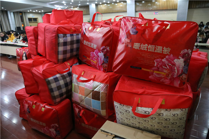 最后,宋静给特困生代表发放了暖冬棉被、各级专业辅导员给同学们发放了暖冬文具。千里送鹅毛,礼轻情意重。即使暖冬物资并不是特别贵重,同学们仍然热情高涨,在发放物资时发出欢呼。每一位特困学生代表在接过老师递来的物资时脸上都洋溢着笑容,向老师及学院表示了真挚的谢意。在老师的引导下,同学们积极有序地上前领取,每个人都领到了属于自己的一份。