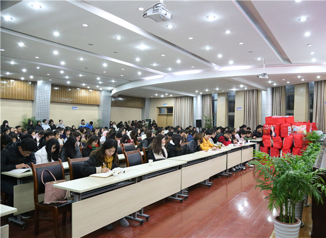 首先,张雁汇报了本学期学院资助情况。本学期9月份依据学校要求,各年级各专业开展了2016-2017学年家庭经济困难学生的评定工作,严格按照“个人申请——班级评议——辅导员审核——学院评审——公示”的程序,我院今年一共有457名学子认定为家庭经济困难学生,本学期发放助学金额达141万余元。其中,包括国家助学金、国家励志奖学金、临时困难补助、勤工助学金等,还有社会人士设立的如杨燕制药助学金、晨光奖助学金、大益奖助学金等。此次暖冬行动发放资助额和物资共达近2万元。真正做到了贫困生资助百分百覆盖。接下来张雁又向大家介绍了学院近年来所涌现出的众多优秀典型。