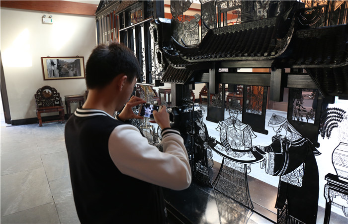一走进徽商博物馆的大门,学员们便被矗立在展厅中央的巨型铁画《铁打丹青》所吸引,《铁打丹青》高3.5米,宽8米,最厚部分达0.4米,重近3吨,是“史上最大、最重的双面透雕立体铁画”。听馆内工作人员介绍,作品讲述的一个关于铁画诞生和发展的历史故事。“看《铁打丹青》,与其说是在欣赏一件工艺品,不如说是在观瞻芜湖铁画的发展轨迹,抑或是感受这一文化所承载的厚重历史。”学员们一边感叹铁画工艺的精湛一边赞叹自古以来铁画师们为之付出的心血和汗水。