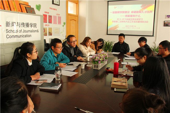 紧接着,2014、2015级各专业代表就个人在专业学习和参加学院组织活动的经历的基础上发表了学习报告精神的感受和对学院下一个阶段发展的建议。2014级新闻学专业的汪芳苗就学院在推动马克思主义新闻观专题课程的学习模式的问题上分享了自己的意见;2014级播音与主持艺术专业的张书朋抓住“立足当下”一词阐述了”一流新闻学院建设卓越新闻人才培养---我能做些什么?”的学习体会;2014级摄影专业的方旭、广告专业的张进文和动画专业的王晓杰结合三年的学习经历,从专业学习的现状和个人对于专业建设发展的角度提出了自己的意见,希望学院能够在总结发展经验和对比国内其他优秀的新闻传播学院的基础上进一步地完善办学实力,为学生的专业发展提供更清晰的培养思路和更丰富的设备条件支持;2014级空乘与礼仪专业的程龙从思考“新传之‘新’”的角度带来了自己对新媒体时代下如何建设既紧跟时代步伐又受到学生喜爱的学院的建议;2015级广告学专业的樊文洁、张嘉琪和播音与主持艺术专业的殷武就如何紧密联系课堂、精简人才培养方案和改善课堂机制的角度交流了自己的看法。