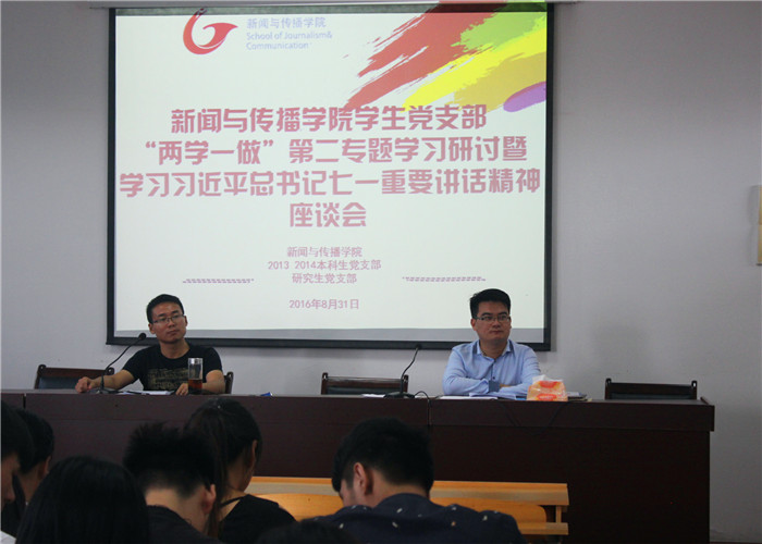 全体党支部成员首先观看《庆祝中国共产党成立95周年大会》视频,马星宇领学习习近平总书记“七一”重要讲话,2013级本科生党支部书记陈德洋就“七一”讲话发表了自己的心得体会。两位老师分别指出,我们要严格的遵守准则和条例,作为学生干部和学生党员,自己要提高修养意识,做优秀的新闻传播人才。随后,陈德洋明确了学习“七一”讲话要求,让在座的学生党员更加了解了自身的职责和讲话的必要性。随后,各个党支部联合开展了“两学一做”第二专题研讨,各党支部的专业代表进行了自己的学习感受发言。研究生支部代表焦睿作为一名校媒人,根据自己的校媒经历表示,我们要自己尽可能的多做,不要总是要求别人做什么。14新闻的何修豪则向大家分享了自己游学台湾所写的一篇文章《在海峡的另一边》,文章中何修豪展现了台湾民众的党政观念,并提出,骂的无理,我们反驳,骂得有理,我们接受。