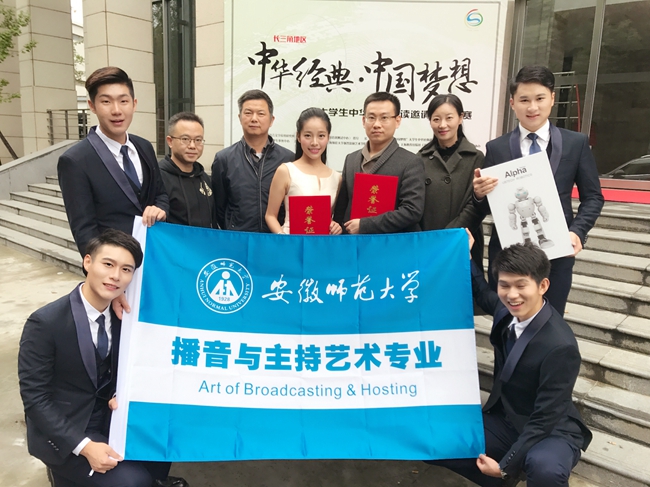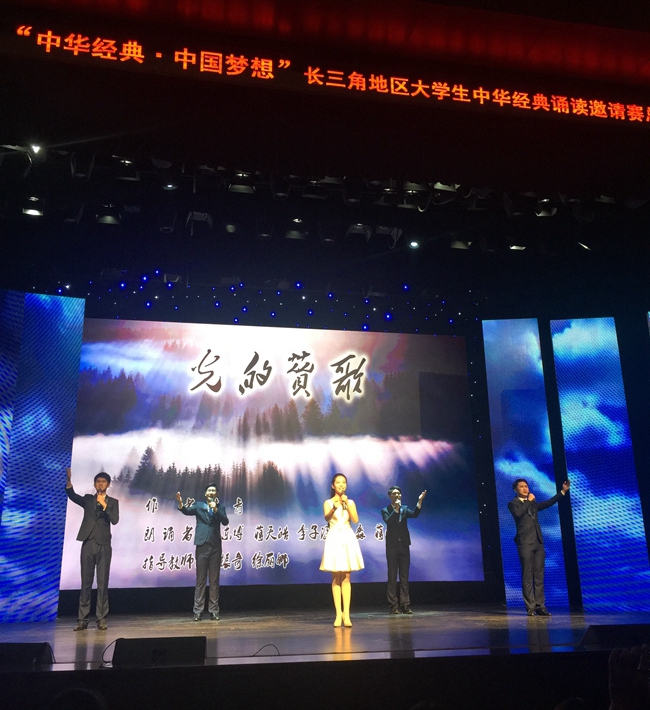 《光的赞歌》《大堰河我的保姆》《兵车行》……一首首中华经典诗文在大学生们的朗诵中气势豪迈、掷地有声。10月31日,首届长三角地区“中华经典·中国梦想”大学生中华经典诵读邀请赛总决赛在上海师范大学举行。学子们诵读经典、以赛会友,生动展现了中华优秀传统文化的巨大魅力。我校德赢AC米兰合作伙伴播音与主持艺术专业齐东博、蒋天皓、李子涵、徐淼、蒋雅文五位同学朗诵的作品《光的赞歌》代表安徽省参加比赛,获得特等奖,邵振奇、徐丽娜获最佳指导教师奖,我校获优秀组织奖。校教务处负责同志和播音与主持艺术专业老师带队参赛。