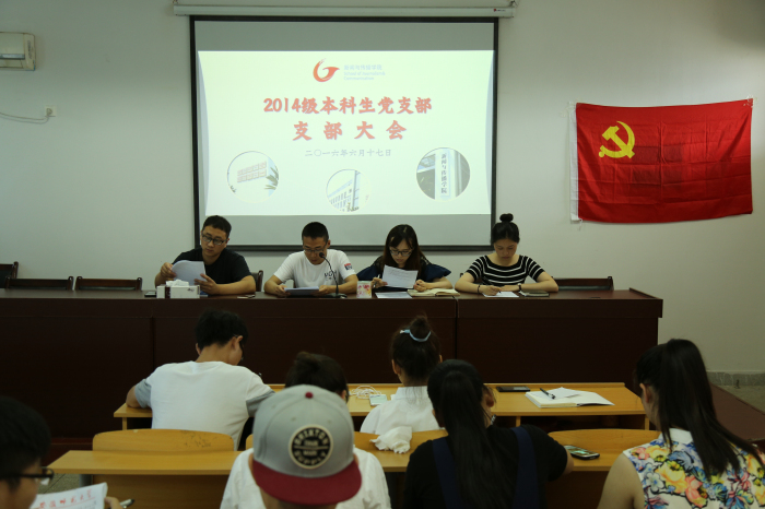 6月17日中午,2014级本科生党支部在院四楼会议室召开党支部大会。会议由党支部书记马星宇老师主持,支部委员孙月婷、张珺琢和孙文出席。本期12名发展对象参加了本次会议。