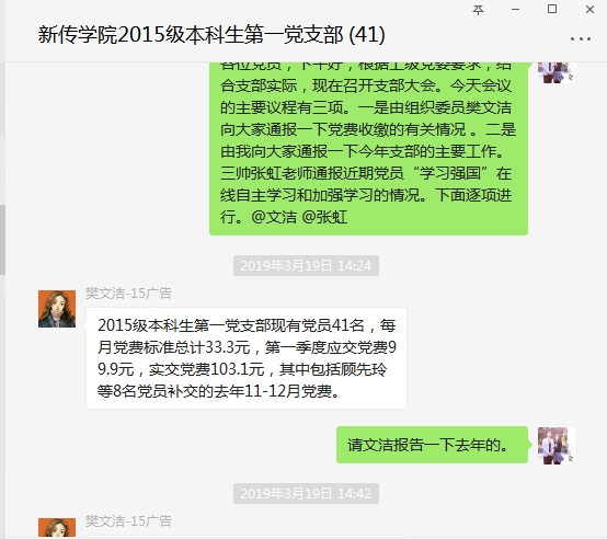 党员大会上,马星宇通报会议的主要议程后,组织委员樊文洁向大家通报了2018年支部党费的收缴情况,41名党员同志,按时交纳了党费。去年12月入党的党员同学也已补交党费。随后,宣传委员张虹通报了近期支部党员“学习强国”APP的学习情况,她指出,近期在学习强国坚持学习,观看了慕课,很有现实意义,希望支部其他同学,能提高认识,用好学习强国的平台,利用好优质学习资源,把学习提升当做自觉,提高学习的实效性,不断克服本领恐慌。