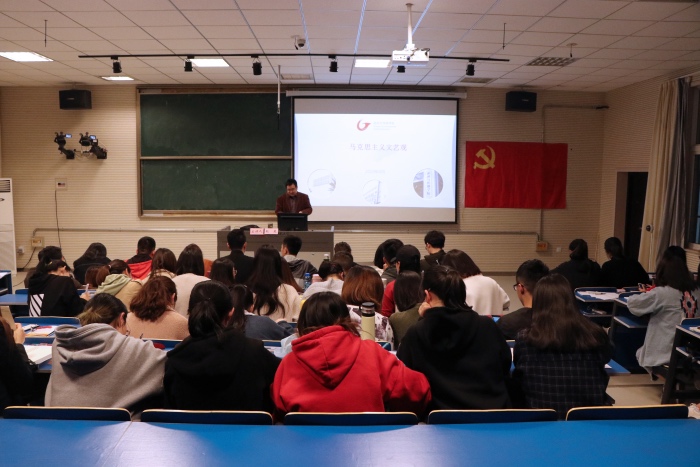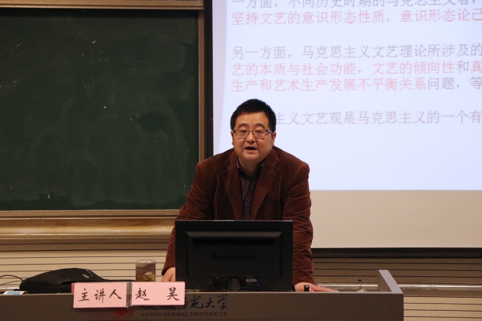 课上,赵昊向学生党员们讲授了什么是马克思主义文艺观,指出马克思主义文艺观是马克思主义的一个有机组成部分,它的产生是文艺思想史上的一次革命,并从马克思、恩格斯文艺观产生的历史条件、马克思主义文艺观的本质来阐释它的内涵。赵昊分析了马克思主义文艺理论在中国传播、接受与发展的过程,实质上就是马克思主义文艺理论中国化的过程。他重点分析了中国化马克思主义文艺观的形成,并指出,马克思主义文艺观是经过本土化、时代化、民族化的既与经典马克思主义一脉相承又具有新质的文艺观,是经过中国革命、建设和改革实践检验的具有蓬勃生机的文艺观。