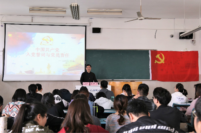 刘晓宇以《中国共产党誓词与党员责任》为题给大家带来专题党课。他以习近平总书记向党宣誓的视频为切入口,告诉党课班成员们要用心记住入党誓词。紧接着,他从入党誓词的沿革、入党誓词的释义和党员的责任三个方面来讲授本次课程。