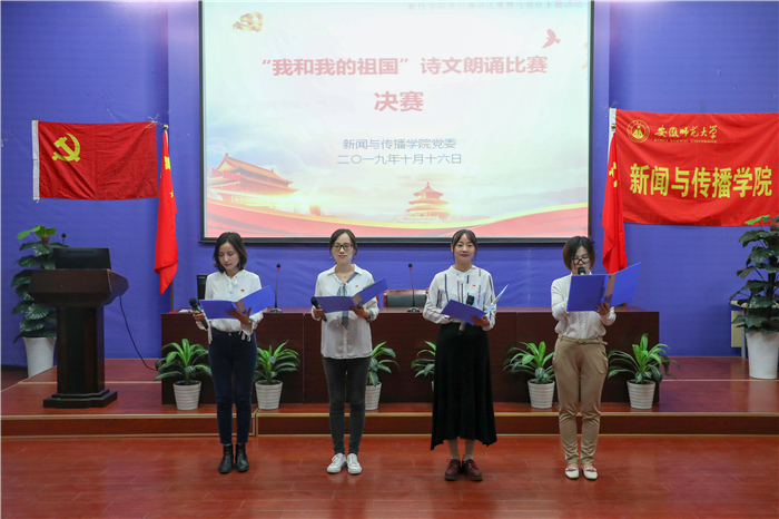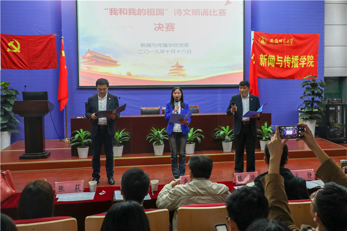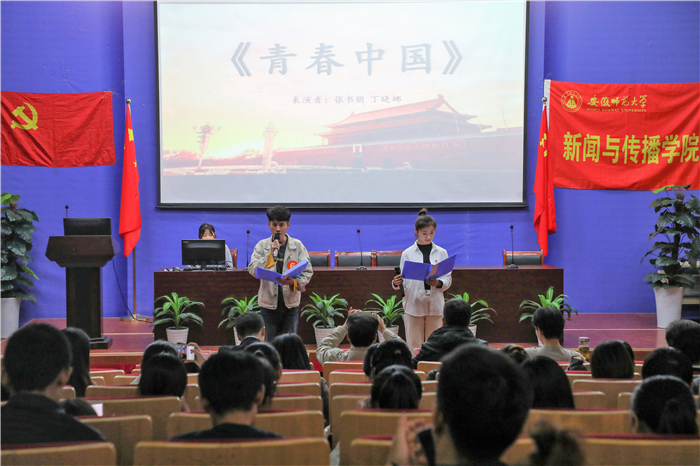 教工组的表现赢得阵阵掌声,学生组的朗诵也毫不逊色。经过前期遴选产生的11组来自不同党支部的选手突出重围,进入决赛。11组选手全力以赴,以真情朗诵礼赞祖国。来自2017级播音与主持艺术专业的徐凡、郭雅茹带来《闪耀吧青春的火光》,抑扬顿挫的语调与肢体动作结合,将观众带入诗歌的语境,体会青春与祖国密不可分的关系;2019级戏剧与影视文学专业的陶钧、劳郡用一首脍炙人口的《您是》娓娓道来祖国的形象;2018级网络与新媒体专业的刘欣颖带着原创长诗《在路上》分享其看完电影《我和我的祖国》的心潮澎湃。比赛在参赛选手的热情朗诵下逐渐达到高峰。比赛结束后,评委对每组参赛的选手进行打分评选。《闪耀吧青春的火光》以优秀的表现拔得头筹。