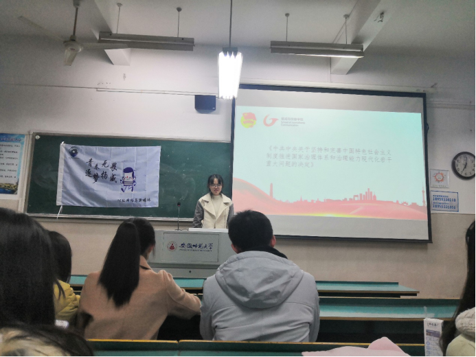 恰逢祖国70华诞,刚刚闭幕的十九届四中全会是为全面建成小康社会、实现第一个百年奋斗目标迈进的关键之年召开的一次会议,充分肯定了我党治理国家取得的历史性成就。从1949到2019,70年风风雨雨,土地革命的实施,朝鲜战争的胜利,社会主义建设的不断推进,以及改革开放的实行,我党始终站在最广大人民群众的立场上,为人民群众谋福祉。2018级的学生作为千禧宝宝,是中国这十几年来快速发展的见证者,对党为人民幸福做出的努力感同身受。11月26日,2018级新闻学在2050402开展了团课学习-十九届四中全会班级精神交流会。11月27日,2018级广告学集体学习了十九届四中全会精神,网新班紧跟其后,于当日晚,举办交流会,共同感触时代脉搏,学习党章知识。