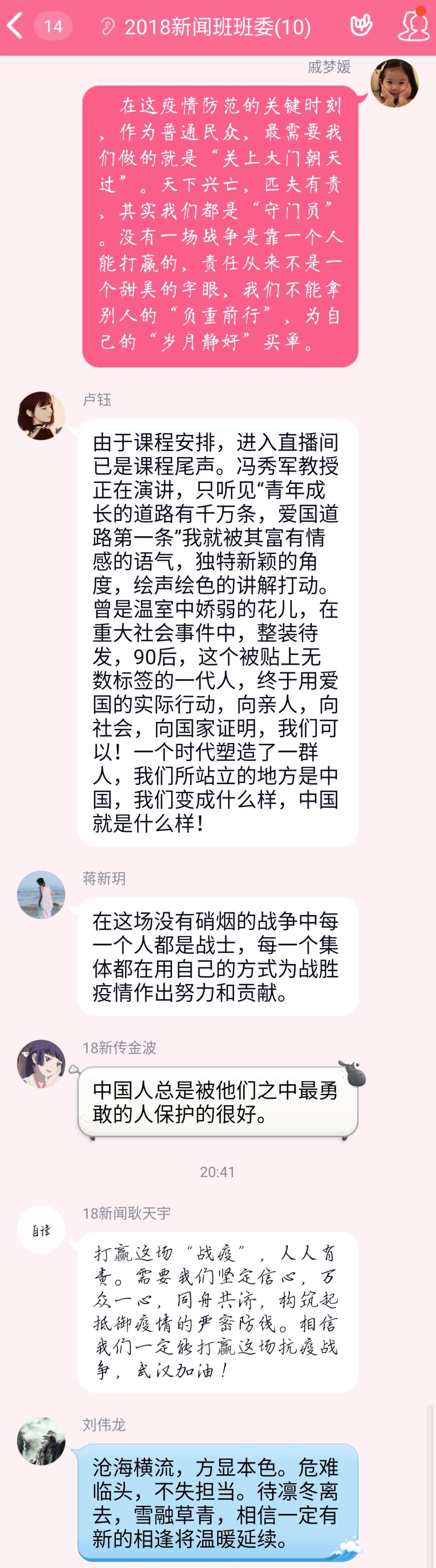 2018级新闻与传播专业研究生冯晓敏:在这场疫情防控中,我能够感受到社会主义集中力量办大事的优势,社会各界纷纷投入到疫情防控中,其中也有许多普通党员的身影。作为一名学生党员,我们应该努力贡献自己的一份力量,不信谣不传谣,不为社会增加负担。在家也要制定好学习计划,学习不止步。就如这堂课上所说,新时代青年要肩有大任,要勤学奋斗、增长才干,才能用科学精神和专业本领保护我们想保护的人。