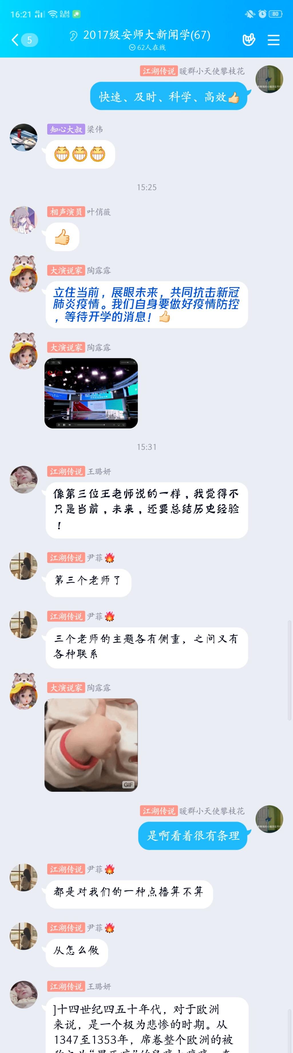 2016级新闻学专业丁纪:听完思政课,在教授们详细的描绘中,我深刻地认识到在新冠肺炎疫情发生时国家做出的努力。从火神山雷神山医院的建立,到全国各地的医护人员聚集湖北,中国共产党始终把人民群众生命安全和身体健康放在第一位。也是在全中国人民的共同努力下,如今疫情得到了有效的控制。相信经历这次疫情的磨难,中华民族必将吸取历史经验教训,为今后更加理智地面对灾难,更加成熟地采取危机应急措施奠定基础。