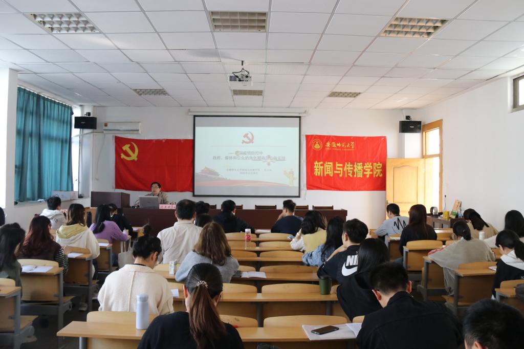 课上,沈正赋指出,伴随着工业化、全球化、信息化的加剧,风险在不同程度地影响着和威胁着人类社会的生存与发展。新冠肺炎疫情是百年来全球发生的最严重的传染病大流行,是新中国成立以来我国遭遇的传播速度最快、感染范围最广、防控难度最大的重大突发公共卫生事件。在党的坚强领导下,全国人民风雨同舟,众志成城,构筑起疫情防控的坚固防线。沈正赋围绕着社会动员在疫情防控中发挥的重要作用,用精炼的语言概括出我们国家的政治资源优势,组织系统优势、渠道多元优势以及群众基础优势。“我们之所以能够在短时间内取得疫情防控的阶段性胜利,正是全国人民的参与和支持,同舟共济,守望相助”。实践再次充分证明中国社会主义制度能够集中力量办大事。接下来,沈正赋总结分析了此次突发公共卫生事件中我国各级政府、新闻媒体和普通民众积极采取的各种应对措施,发挥各自优势,利用舆论力量及时传达信息,建构了负责任的大国形象。其中,危机管理更胜一筹,政府利用各种信息通道,及时向世界传达中国声音;舆情应对及时高效,媒体机构发挥第三方资源优势,积极引导世界舆论;共情传播凝聚力量,公众凭借移动终端功能,扮演人人都是国家形象塑造者的角色。